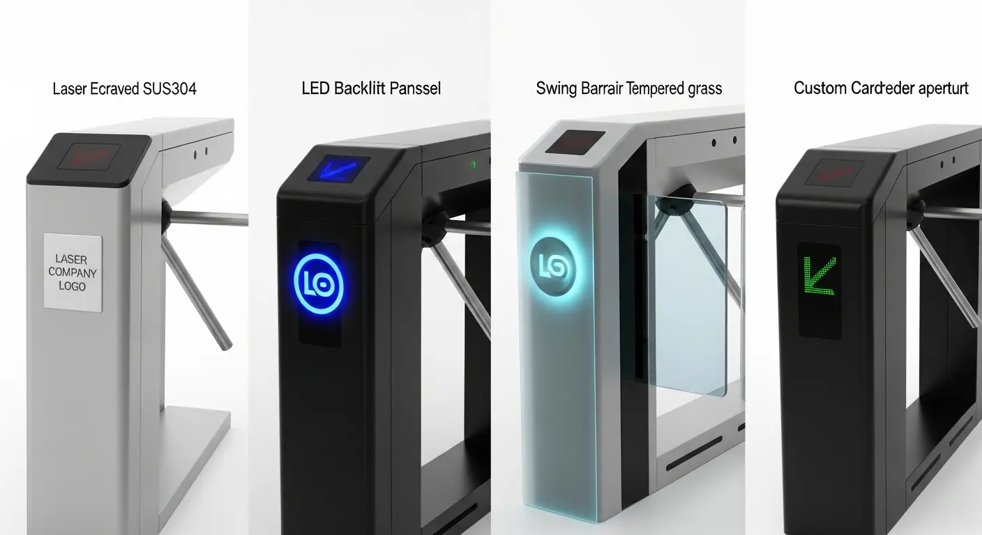 A custom turnstile gate isn't just a standard model with your logo on it. The customization spectrum runs from surface branding — laser-engraved logo, RAL powder coat color, brushed finish — all the way to full engineering changes: modified lane width, custom panel material, bespoke cabinet profile, climate-specific components, and OEM white-label manufacturing for resellers.