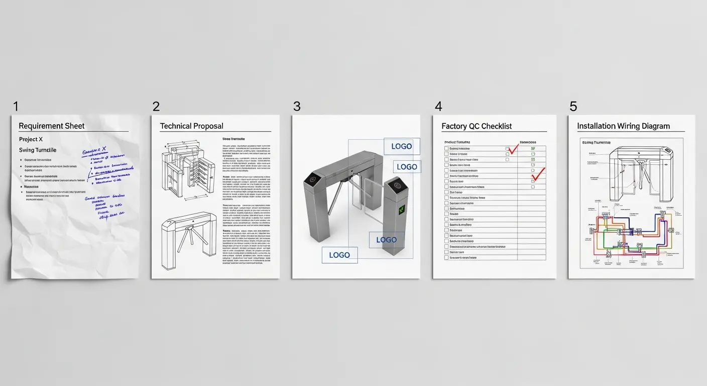 A custom turnstile gate order should include: wiring diagrams specific to the custom reader configuration, installation drawings showing anchor point positions and cable entry locations, and a commissioning test record confirming fail-safe, anti-tailgating, and anti-pinch functions.