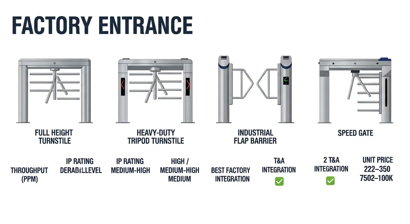 | Gate Type | Throughput | IP Rating | Durability | Security Level | T&A Integration | Best Factory Entrance | Unit Range |