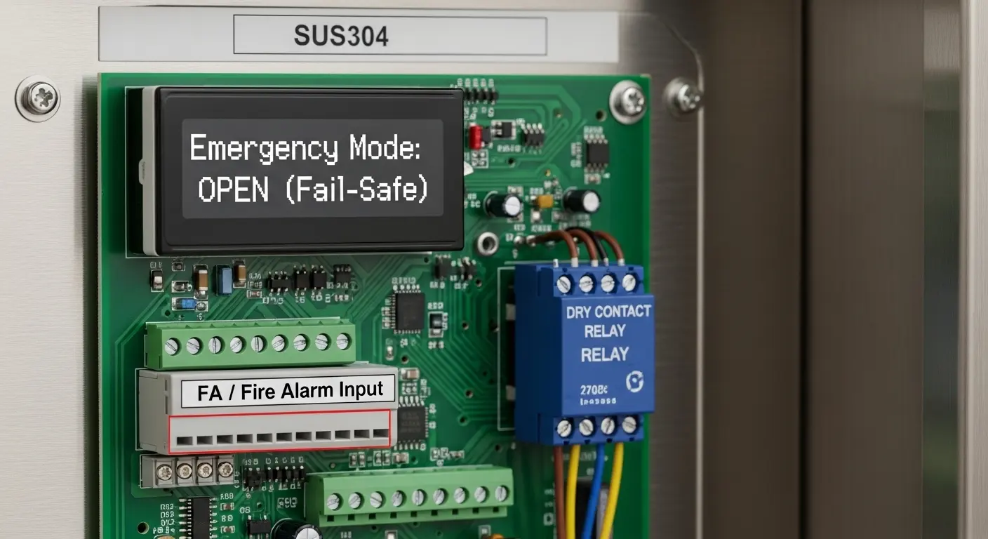 A normally closed (NC) relay is the standard for fire alarm input. Under normal conditions, the circuit is closed. On fire alarm activation, the circuit opens — and the control board triggers fail-safe release. Confirm NC logic in the wiring diagram. Some boards support both NC and NO configurations with a jumper setting.