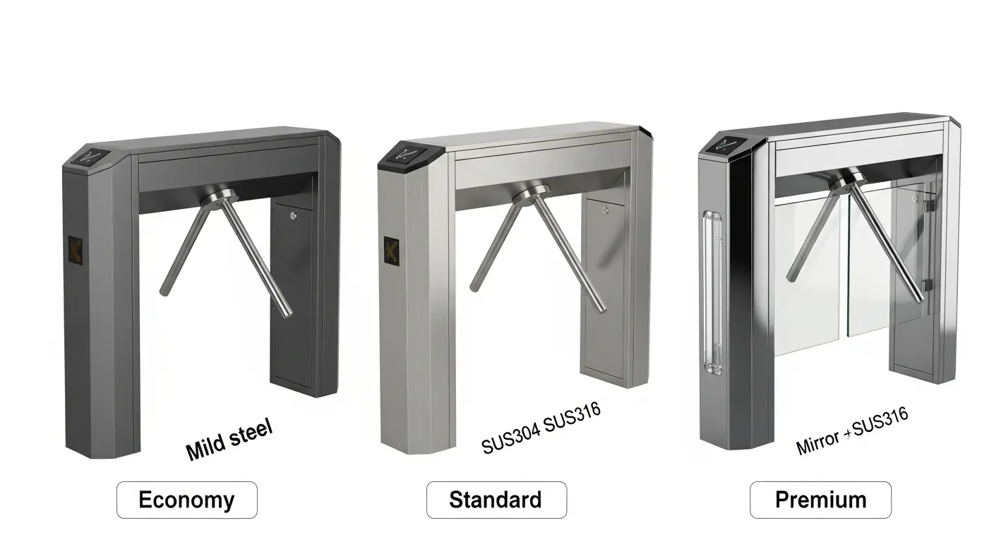 Single-lane models carry the base price. Tandem (double-lane) configurations share one structure but add a second arm assembly — they cost 60–80% more than a single lane but process twice the traffic, which makes them more cost-efficient for high-volume entry points. Triple-lane models are available from specialist suppliers and carry proportionally higher full height turnstile price tags.