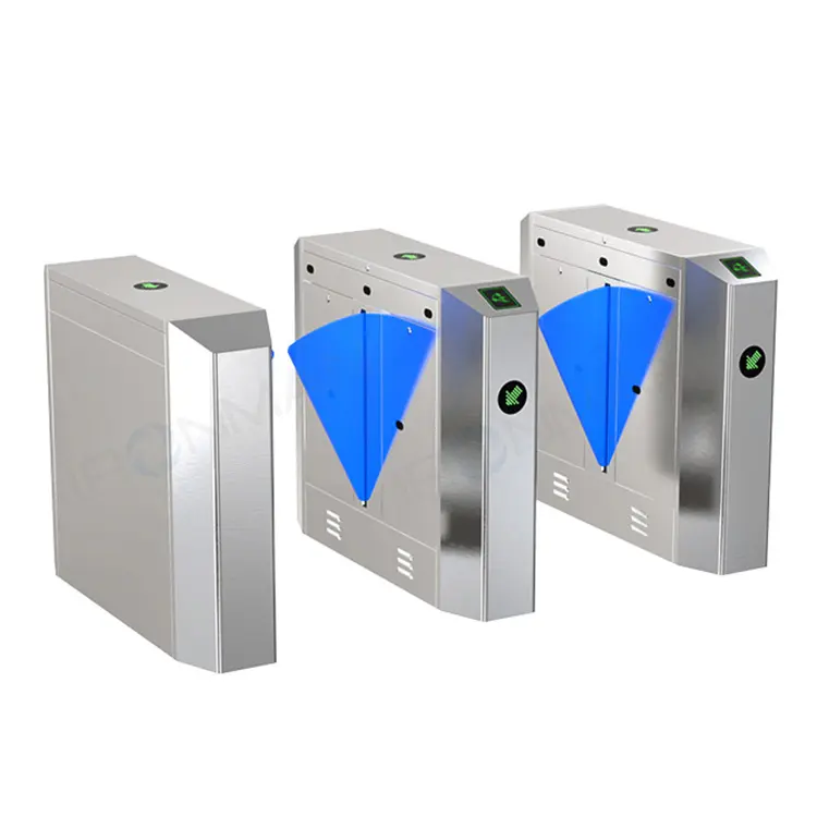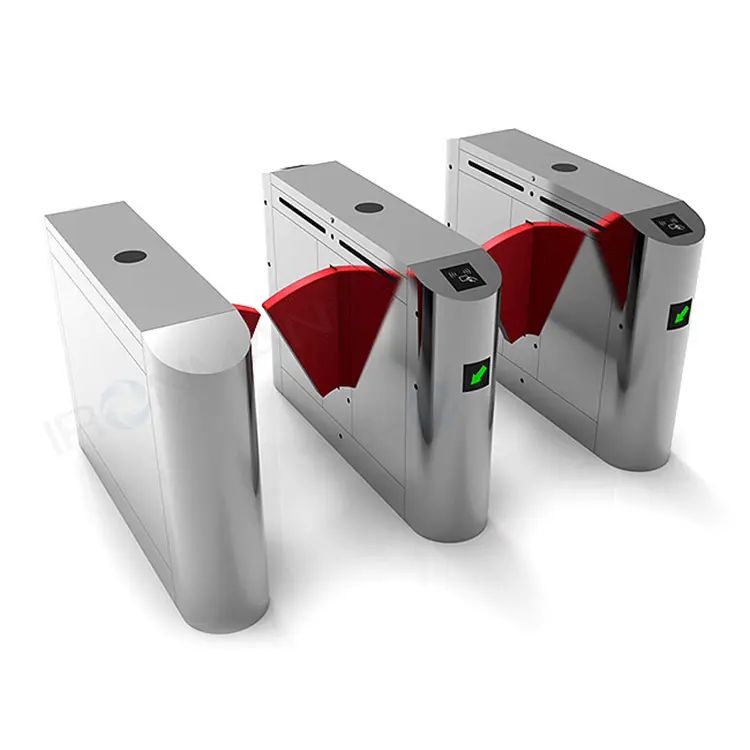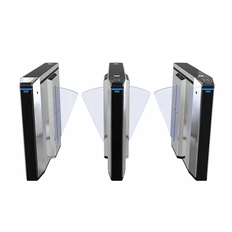 Flap barrier turnstile. allows people to move smoothly in places with heavy traffic of pedestrians. The structure is made out of hard stainless steel and therefore can be worn out easily on a daily basis without any scars or other marks as well as being sleek and professional in appearance.