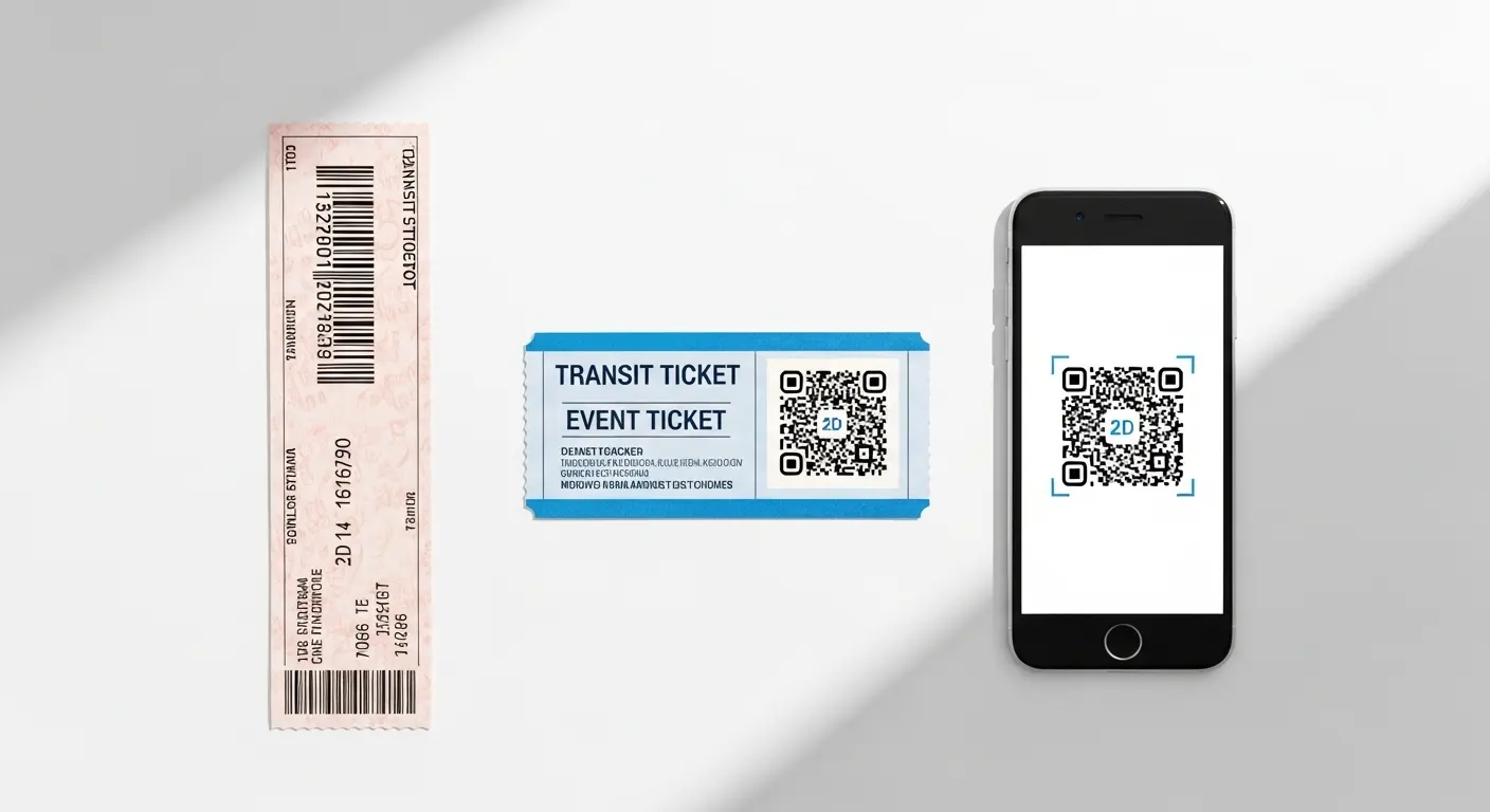 One-dimensional barcodes encode data in a series of parallel vertical lines of varying width. They are the older format, widely used in legacy transit ticketing systems, retail membership cards, library systems, and paper event tickets issued before QR adoption became standard.