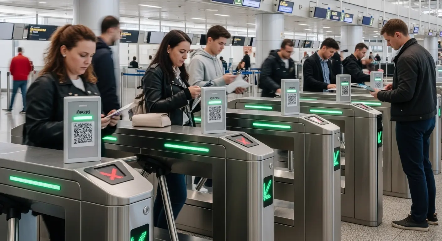 Boarding passes carry barcode and QR data by design. A turnstile gate with barcode scanner reads mobile boarding passes and printed tickets at the same hardware without any passenger registration step. At boarding gate entry, the scanner verifies the passenger against the DCS in real time — opening the gate for the correct flight and denying any passenger on the wrong departing code. The airport speed gate system is configured specifically for this boarding verification workflow at airport-grade throughput rates.